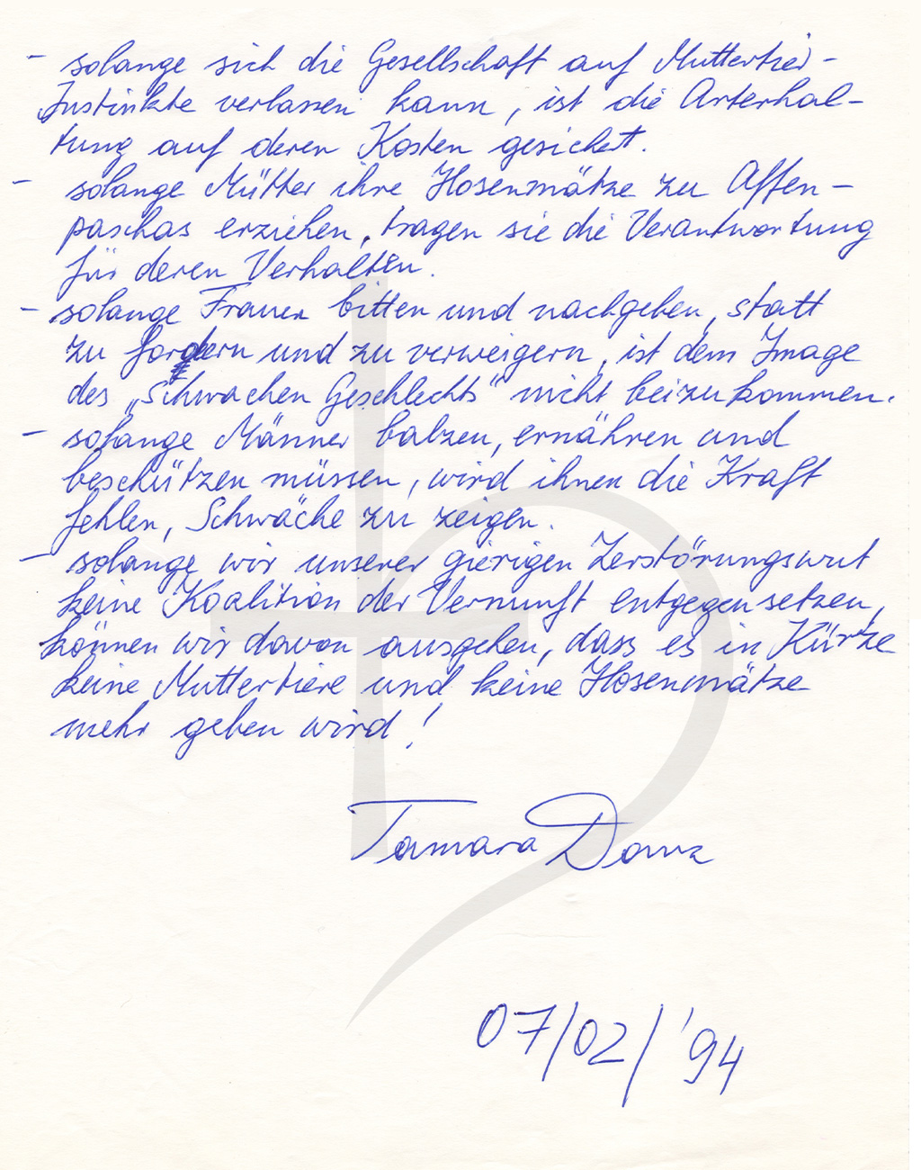 »Wie viele andere habe ich Tamara zum ersten Mal im Fernsehen und in Zeitschriften gesehen. Sie wirkte sexy. Vielleicht auch etwas schrill. Aber: Sie war weit weg. Wir lebten in zwei verschiedenen Welten. Später, als ich sie dann kennenlernte, machte ich eine erstaunliche Erfahrung: Unsere beiden Welten trennten uns überhaupt nicht. Wir waren überraschend dicht beieinander. Wir hatten unterschiedliche Freunde, aber dieselben Feinde. Das war der Anfang. Tamara und ich waren füreinander da. Wir führten tiefsinnige Gespräche, konnten aber auch genauso gut über unsere müden Späße lachen. Und wir konnten miteinander schweigen. Einmal hat sie mich ermahnt, ich solle endlich aufhören, mein Leben der Vernunft unterzuordnen. Das hat mein Leben völlig verändert: Von da an war ich nicht mehr zu feige für die Freiheit. Tamara hielt keine Predigten, sie gab einem einfach nur die Würde zurück. Sie war eine Freundin der offenen Worte, die andere Menschen aufrichten konnte. Wenn sie sich auf fremde Probleme einließ, dann war sie wie eine Offenbarung. Da ist es doch klar, dass man sie – auch als ihr Ende absehbar war – niemals, niemals loslassen wollte. Es heißt, es gäbe zwei wichtige Kriterien dafür, ob jemand ein gutes Leben gelebt hat: Hat man das verwirklicht, was man beabsichtigte? Und: Waren andere froh, dass man gelebt hat? Im Fall von Tamara können beide Fragen mit einem klaren Ja beantwortet werden.«